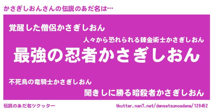| 男性向けラノベタイトル風あだ名 | 『かさぎしおん~年齢イコール彼女いない歴の魔法使い~』 |
