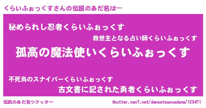 | ヒーロー風カッコイイあだ名 | 『暗黒騎士クラ』『ネオクライフォックス』 |