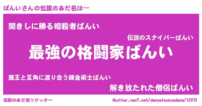 | 男性向けラノベタイトル風あだ名 | 『ばんい~年齢イコール彼女いない歴の魔法使い~』 |