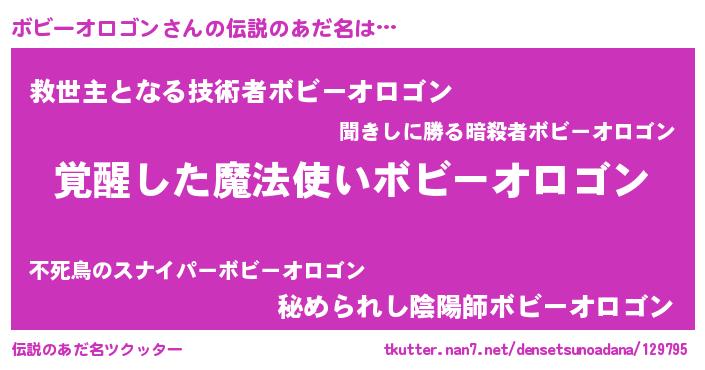 | 男性向けラノベタイトル風あだ名 | 『ボビーオロゴンの嫁は女の子じゃないと思った?』 |