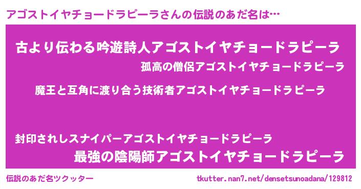 | 女子向けラノベタイトル風あだ名 | 『乙女ゲームの破滅フラグしかない悪役アゴストイヤチョードラピーラに転生してしまった…』 |