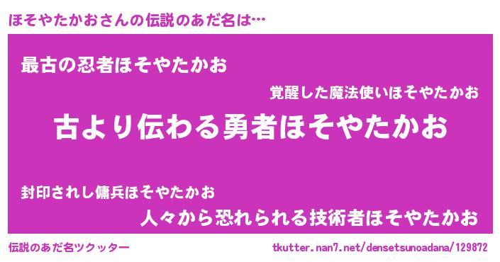 | ヒーロー風カッコイイあだ名 | 『仮面ホソダー』『ネオホソヤタカオ』 |