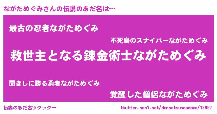 | 男性向けラノベタイトル風あだ名 | 『ながためぐみ~年齢イコール彼女いない歴の魔法使い~』 |