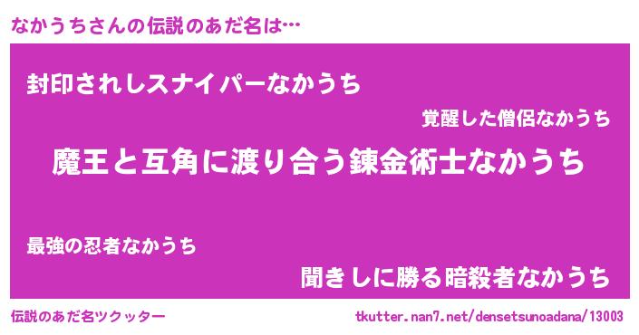| 男性向けラノベタイトル風あだ名 | 『転生したらなかうちだった件』 |
