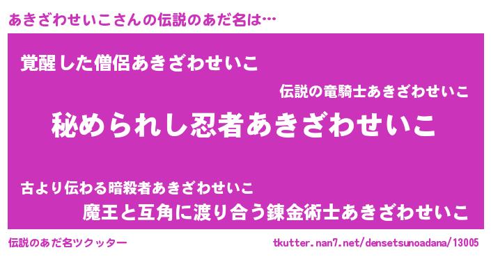 | 男性向けラノベタイトル風あだ名 | 『魔弾の王とあきざわせいこ』 |