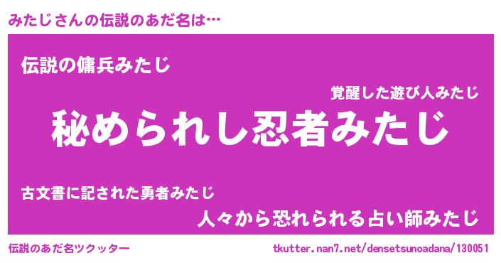 | 男性向けラノベタイトル風あだ名 | 『ミタジスレイヤー』『魔弾の王とみたじ』 |