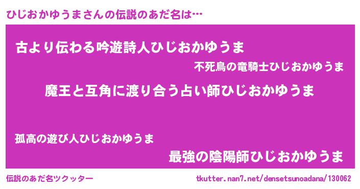 | 意味不明あだ名 | 『もやし科ひじおかゆうま属』 |