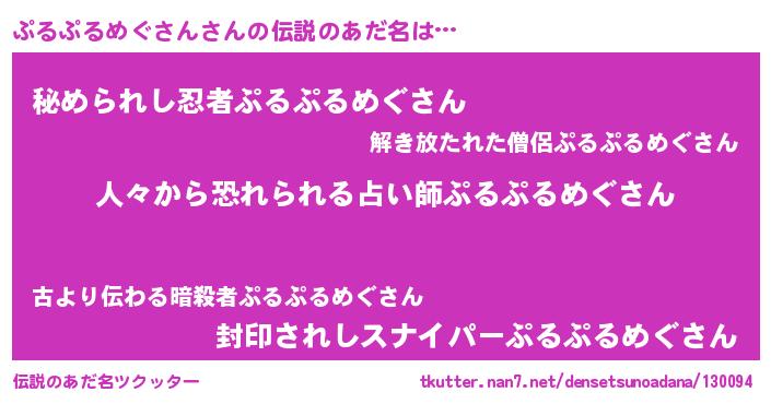 | ヒーロー風カッコイイあだ名 | 『正義の使者ぷるぷるめぐさん』 |