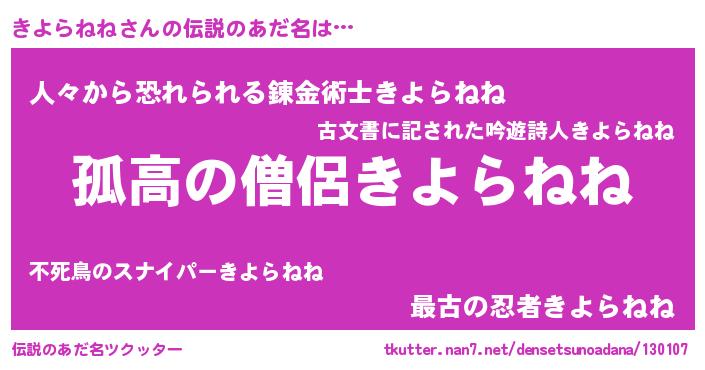 | 意味不明あだ名 | 『とにかく怪しいきよらねね』 |