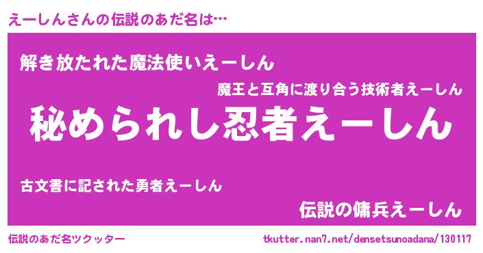| 男性向けラノベタイトル風あだ名 | 『魔弾の王とえーしん』 |