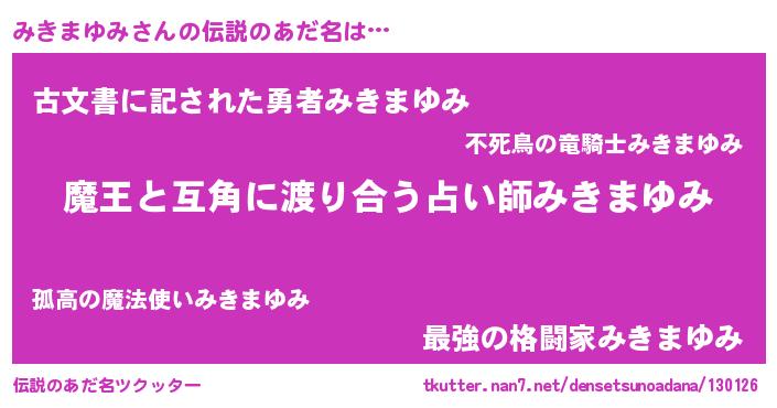 | ヘコむあだ名 | 『みきまゆみ(笑)』『酢こんぶ』 |