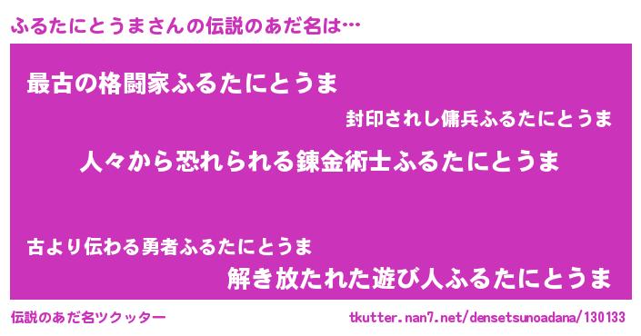 | 男性向けラノベタイトル風あだ名 | 『魔弾の王とふるたにとうま』 |