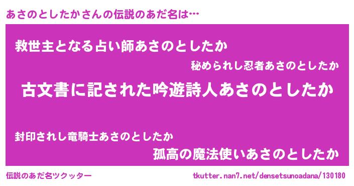 | 男性向けラノベタイトル風あだ名 | 『あさのとしたか~年齢イコール彼女いない歴の魔法使い~』 |