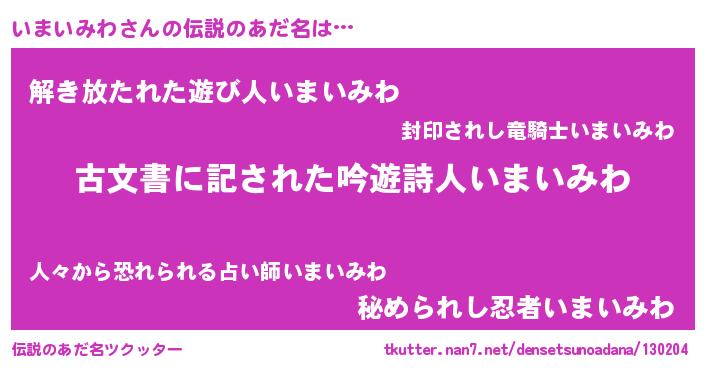 | ヒーロー風カッコイイあだ名 | 『仮面イマダー』『ネオイマイミワ』 |