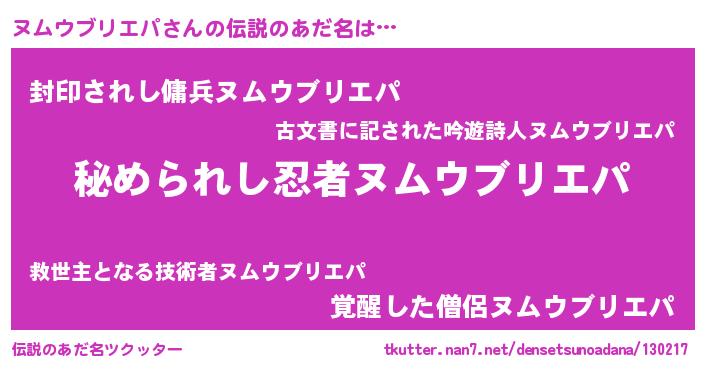| 男性向けラノベタイトル風あだ名 | 『緋弾のヌムウブリエパ』 |