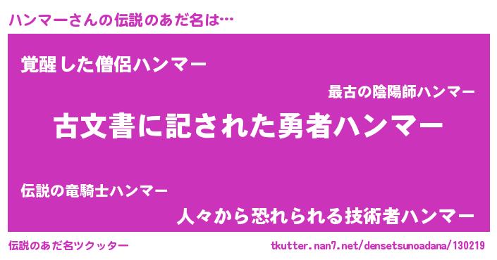 | ヒーロー風カッコイイあだ名 | 『仮面ハンダー』『ネオハンマー』 |