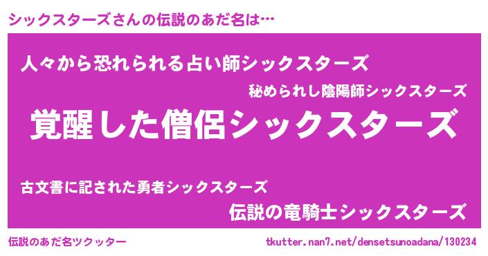 | 男性向けラノベタイトル風あだ名 | 『シックスターズ~年齢イコール彼女いない歴の魔法使い~』 |