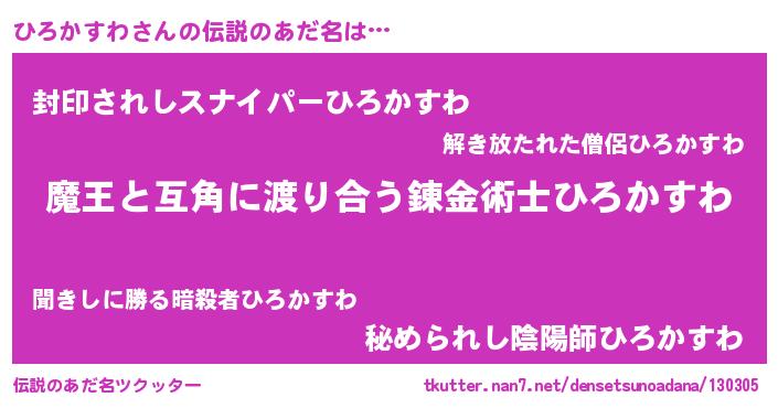 | ヒーロー風カッコイイあだ名 | 『慈愛の使者ひろかすわ』『仮面ヒロダー』 |