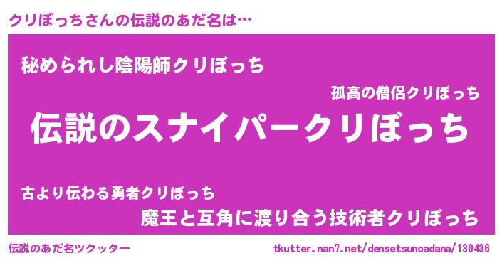 | 男性向けラノベタイトル風あだ名 | 『クリぼっちの憂鬱』『緋弾のクリボッチ』 |
