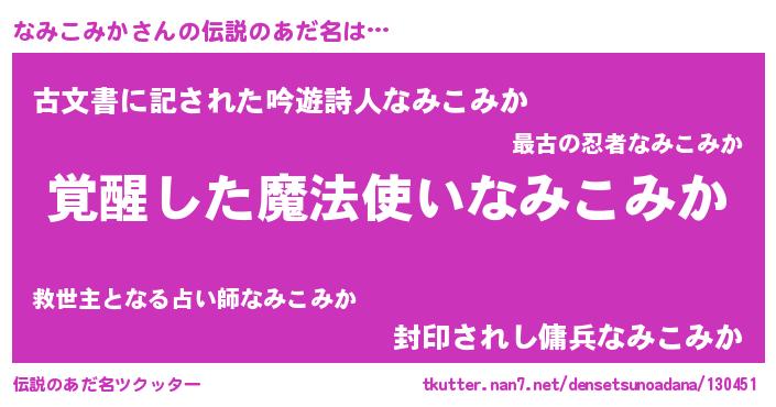 | ヒーロー風カッコイイあだ名 | 『仮面ナミダー』『暗黒騎士ナミ』 |