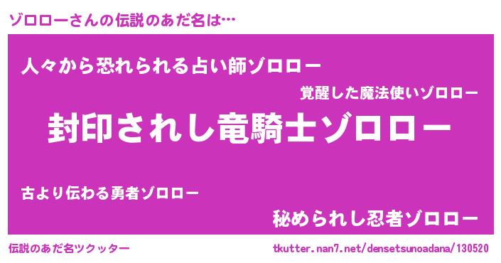 | ヒーロー風カッコイイあだ名 | 『スーパーゾロロー』『仮面ゾロダー』 |