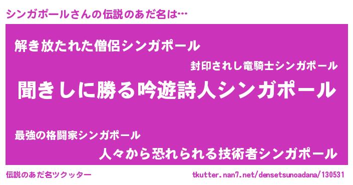 | 男性向けラノベタイトル風あだ名 | 『魔弾の王とシンガポール』 |
