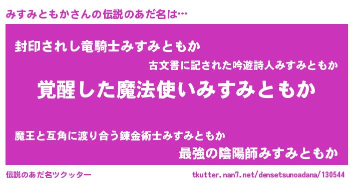 | 男性向けラノベタイトル風あだ名 | 『みすみともかの嫁は女の子じゃないと思った?』 |