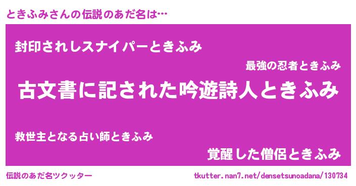 | 男性向けラノベタイトル風あだ名 | 『この素晴らしい世界にときふみを!』 |