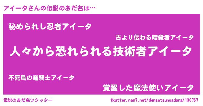 | 男性向けラノベタイトル風あだ名 | 『おまえをオタクにしてやるから、俺をアイータにしてくれ! 』 |