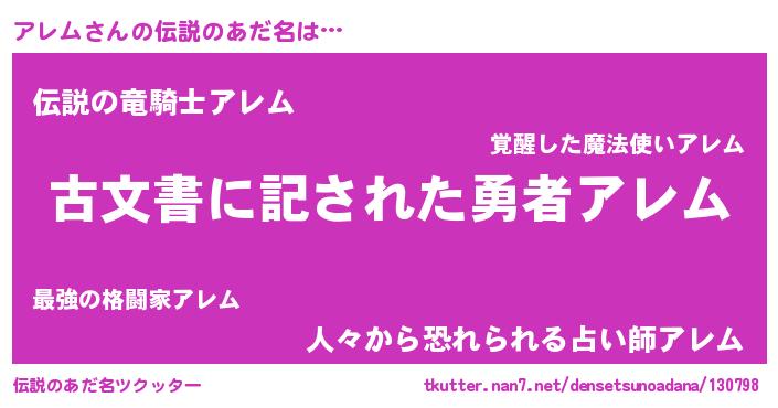 | 胡散臭い通販商品みたいなあだ名 | 『あなたにだけ特別に提供する世界で10本だけ現存している希少なブランデー…その名も「アレム」』 |
