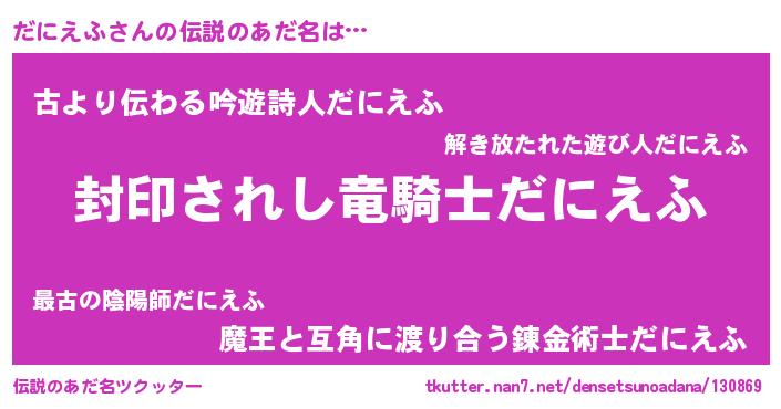 | 意味不明あだ名 | 『つくし科だにえふ属』『自称だにえふ』 |