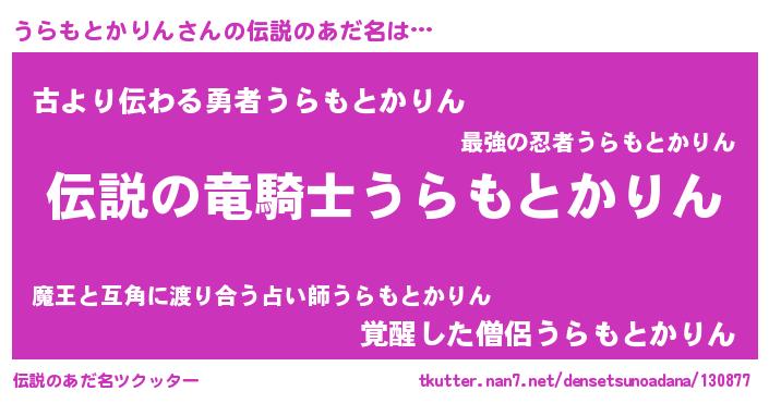 | ヒーロー風カッコイイあだ名 | 『仮面ウラダー』『ネオウラモトカリン』 |