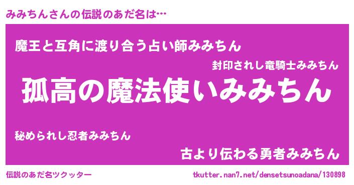 | 胡散臭い通販商品みたいなあだ名 | 『信頼と実績のサプリメント…その名も「みみちん」』 |