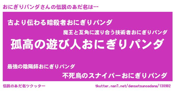 | ヒーロー風カッコイイあだ名 | 『黄金騎士オニ』『ネオオニギリパンダ』 |