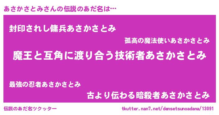 | 男性向けラノベタイトル風あだ名 | 『転生したらあさかさとみだった件』 |