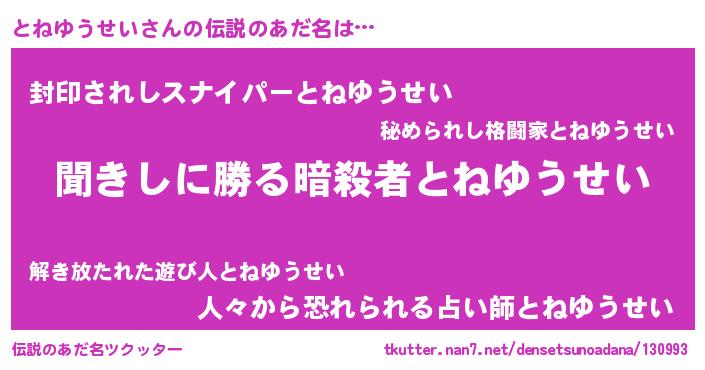 | ヘコむあだ名 | 『とねゆうせい(爆)』『とねもー』 |