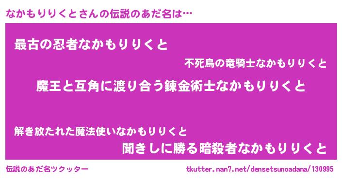 | 男性向けラノベタイトル風あだ名 | 『魔弾の王となかもりりくと』 |