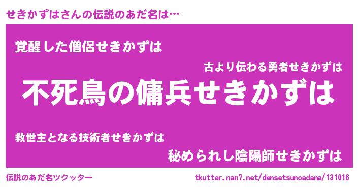 | ヒーロー風カッコイイあだ名 | 『スーパーセキカズハ』『天弓騎士セキ』 |