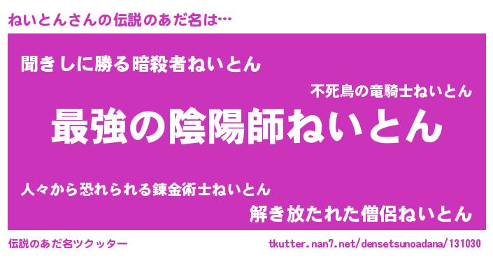 | 男性向けラノベタイトル風あだ名 | 『Re:ねいとんから始める異世界生活』 |