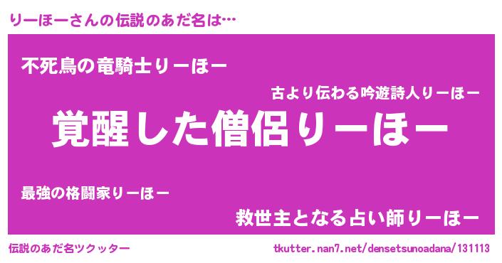| 男性向けラノベタイトル風あだ名 | 『りーほーに滅ぼされるだけの簡単なお仕事です』 |