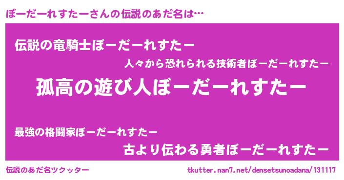 | 意味不明あだ名 | 『とにかく怪しいぼーだーれすたー』 |