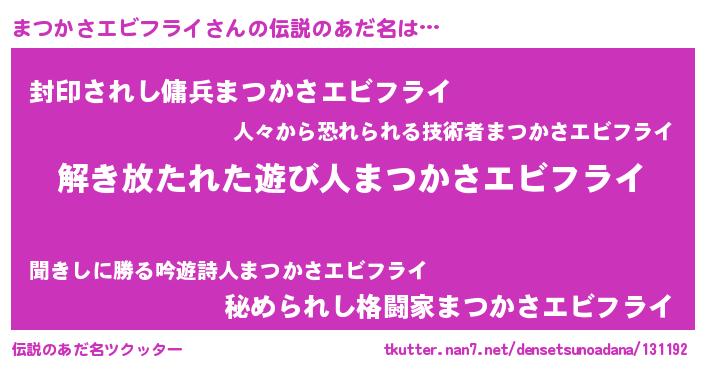 | 男性向けラノベタイトル風あだ名 | 『まつかさエビフライの嫁は女の子じゃないと思った?』 |