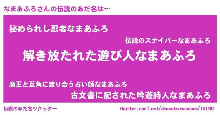 | ヒーロー風カッコイイあだ名 | 『幻影騎士ナマ』『仮面ナマダー』 |