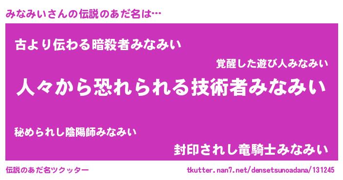 | ヘコむあだ名 | 『みなみい(小並感)』『みなもー』 |