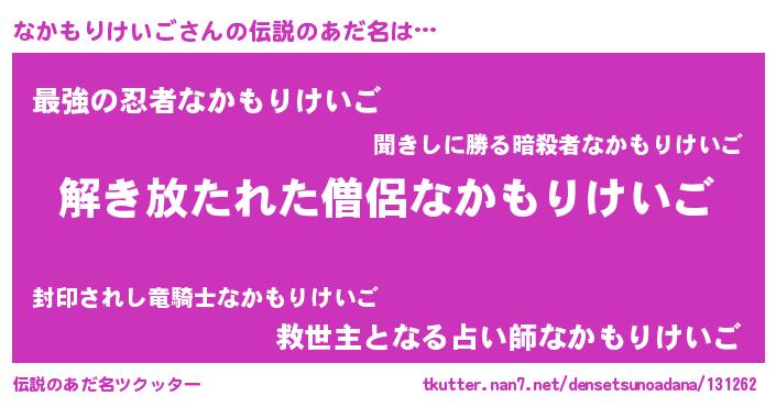 | 男性向けラノベタイトル風あだ名 | 『なかもりけいごに滅ぼされるだけの簡単なお仕事です』 |