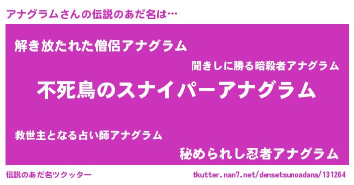 | ヒーロー風カッコイイあだ名 | 『スーパーアナグラム』『魔戒騎士アナ』 |