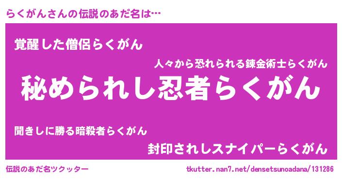 | ヒーロー風カッコイイあだ名 | 『ウルトラらくがんマン』『天弓騎士ラク』 |