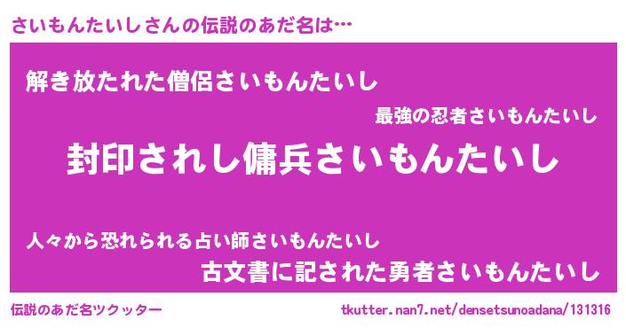 | 男性向けラノベタイトル風あだ名 | 『さいもんたいし~年齢イコール彼女いない歴の魔法使い~』 |