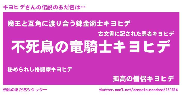 | ヒーロー風カッコイイあだ名 | 『スーパーキヨヒデ』『愛の使者キヨヒデ』 |