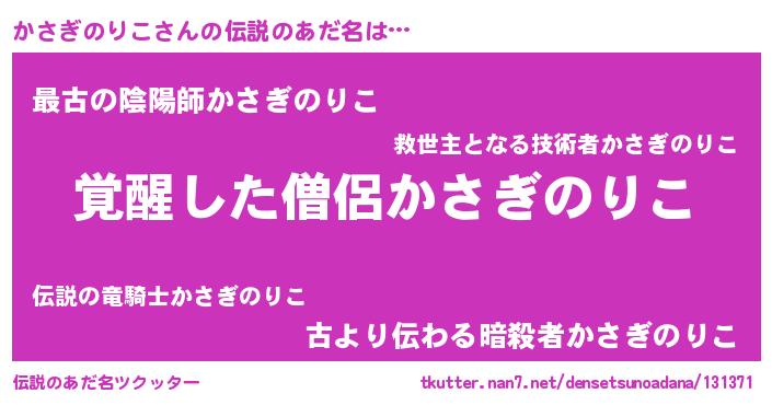 | 男性向けラノベタイトル風あだ名 | 『かさぎのりこの嫁は女の子じゃないと思った?』 |